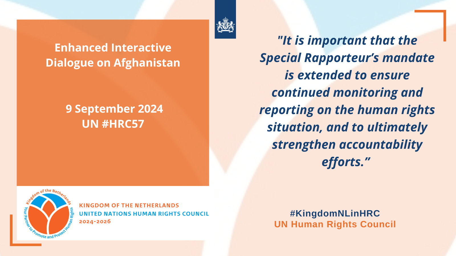 The Kingdom of the Netherlands aligns itself with the EU statement and expresses its sincere appreciation to all speakers. The human rights situation in Afghanistan is alarming. We strongly condemn the Taliban’s systematic and continuously increasing oppression of human rights in Afghanistan. The recently published “vice and virtue” law is another glaring example. Of particular concern are the systematic exclusion of women and girls from public life and education, as well as the targeting of minorities, independent media and human rights defenders.