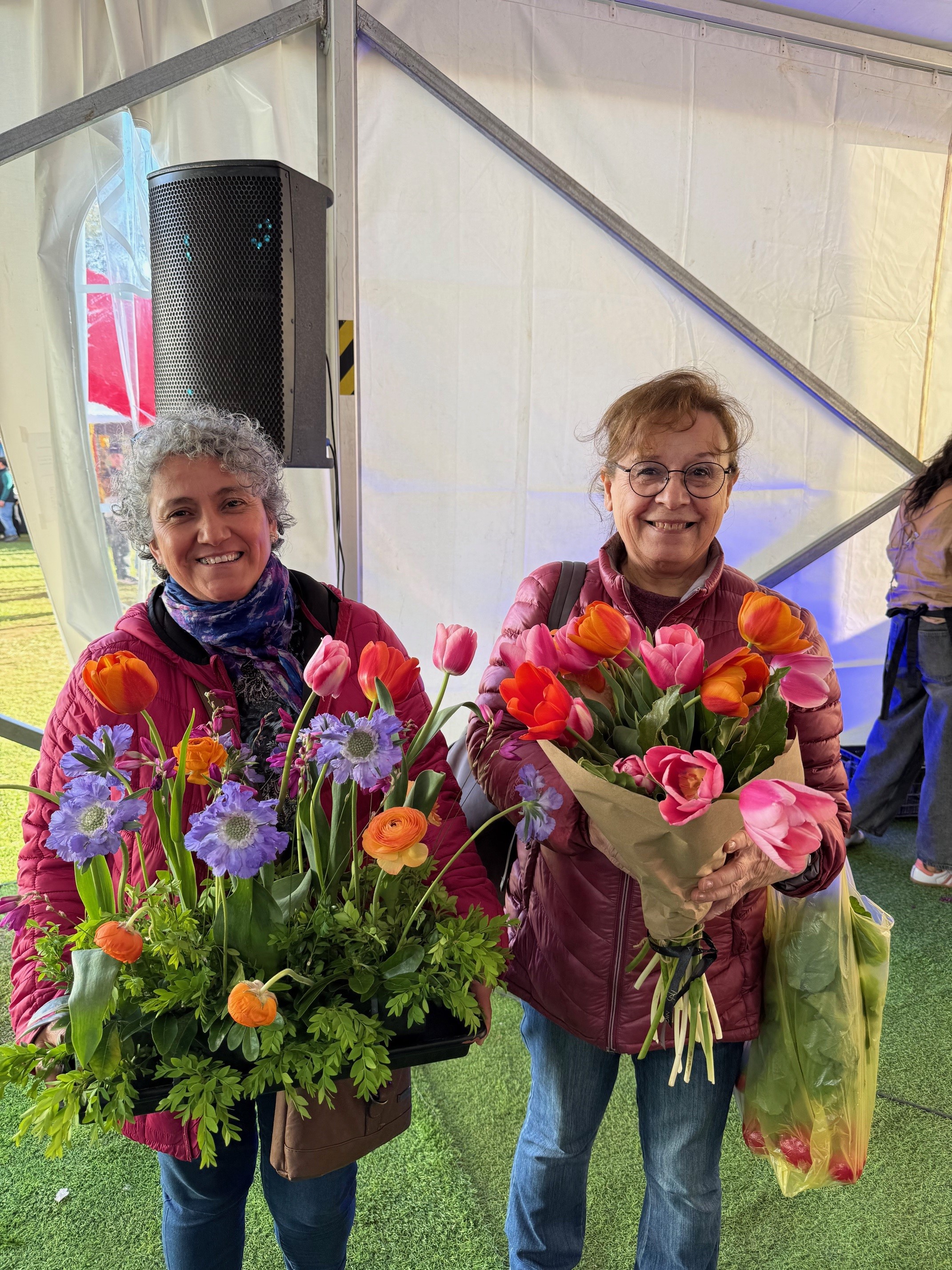 El fin de semana posterior a la conferencia sobre agua, algunos miembros del personal de la embajada viajaron a Valdivia. Además de un consulado pop-up donde 18 ciudadanos neerlandeses pudieron solicitar sus nuevos pasaportes el sábado, los residentes de Valdivia y sus alrededores tuvieron la oportunidad de conocer los Países Bajos en el Encuentro Internacional. Esta fue una feria anual de tres días donde diversos países y productores regionales pudieron presentarse al público. En el stand neerlandés, repartimos 850 tulipanes patrocinados por un cultivador local de bulbos, vestimos a más de 100 personas con trajes tradicionales (incluidos zuecos) para que posaran para fotos con el "Binnenhof" y tulipanes de fondo, y distribuimos más de 10 kilos de queso bajo la atenta mirada de nuestros Reyes, cuya imagen aparecía en un gran cartel. Nuestros compañeros respondieron pacientemente a todas las preguntas del público. Hablaron sobre la relación entre el Rey y la democracia, de qué está hecho el queso neerlandés y por qué es tan delicioso, por qué el queso curado es un poco granuloso, qué árboles se utilizan para hacer zuecos y si nuestras princesas hablan español. Si hubiéramos sacado a relucir nuestro espíritu comerciante neerlandés, probablemente habríamos vendido más de una docena de zuecos (porque son mucho más cómodos de lo que parecen), y probablemente también kilos de queso, que se disfrutó como un capricho. La feria concluyó con un taller profesional de arreglos florales en el escenario, con Nicole Dufey, tulipanes como protagonistas. Los dos afortunados ganadores de los ramos sin duda tuvieron un día inolvidable.